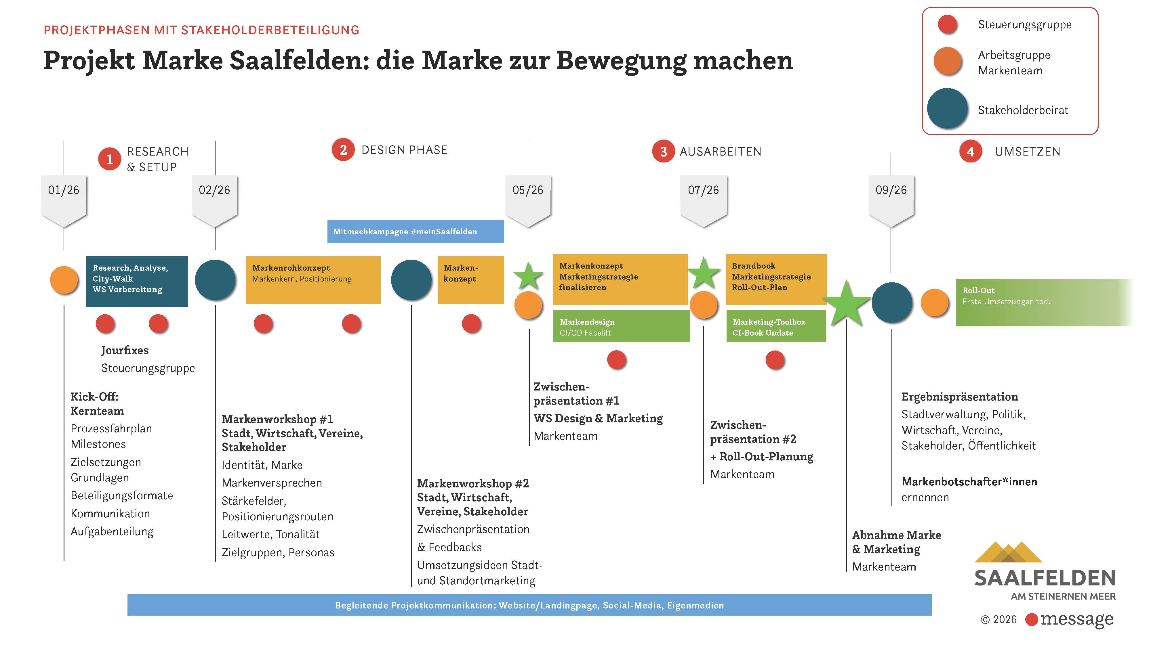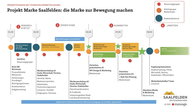 Um Saalfelden im Wettbewerb um die Chancen der Zukunft klar zu positionieren, starten wir einen gemeinsamen Stadtmarkenprozess. Ziel ist es, die Identität unserer Stadt herauszuarbeiten, zentrale Botschaften zu definieren und ein zeitgemäßes, einheitliches Erscheinungsbild zu entwickeln.